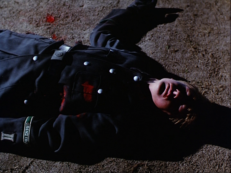 An early scene takes us to the edge of a forest at night. A teenage boy (Matthew Taylor) attempts to breach the border fence using a stolen bulldozer. His efforts are in vain: he is immediately discovered and his body riddled with machine gun fire. As the border guards approach his twisted, bloody remains, one of the officers notes that the boy is still alive. ‘So leave him for a while,’ says his captain, ‘we’ll pick up the body later.’