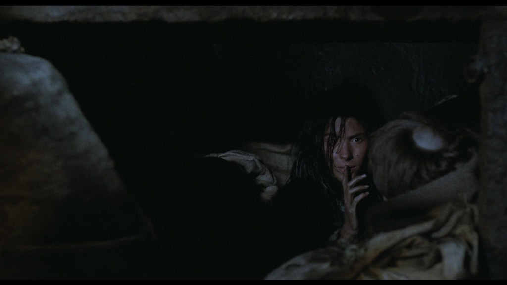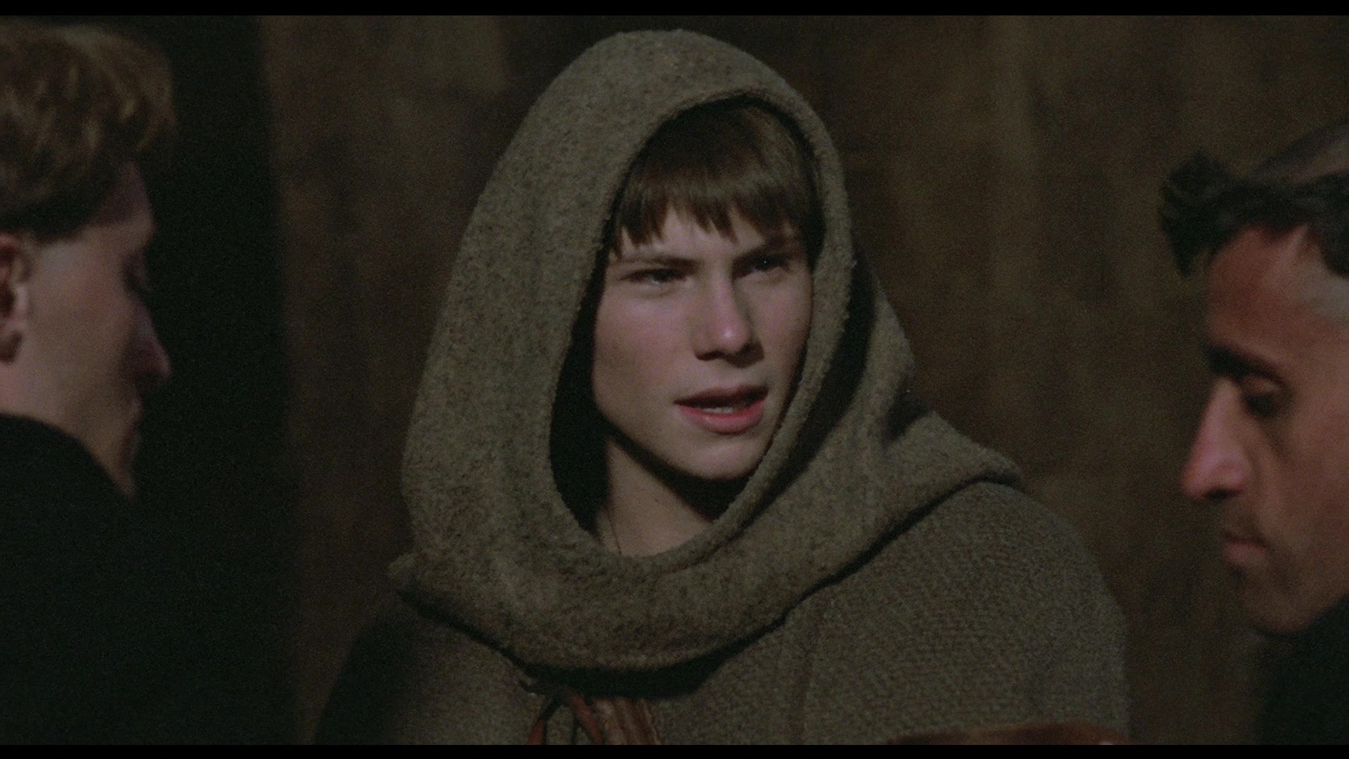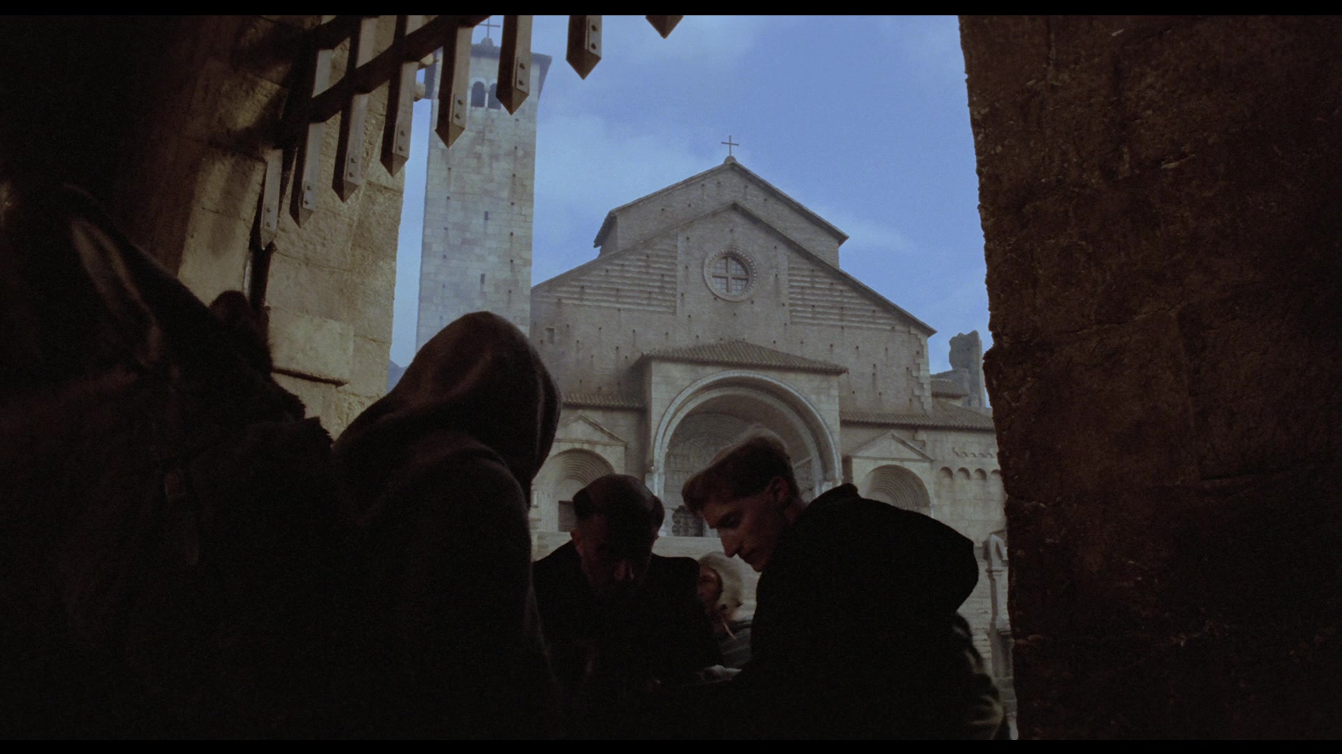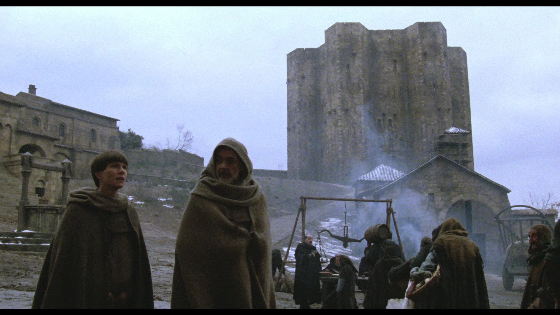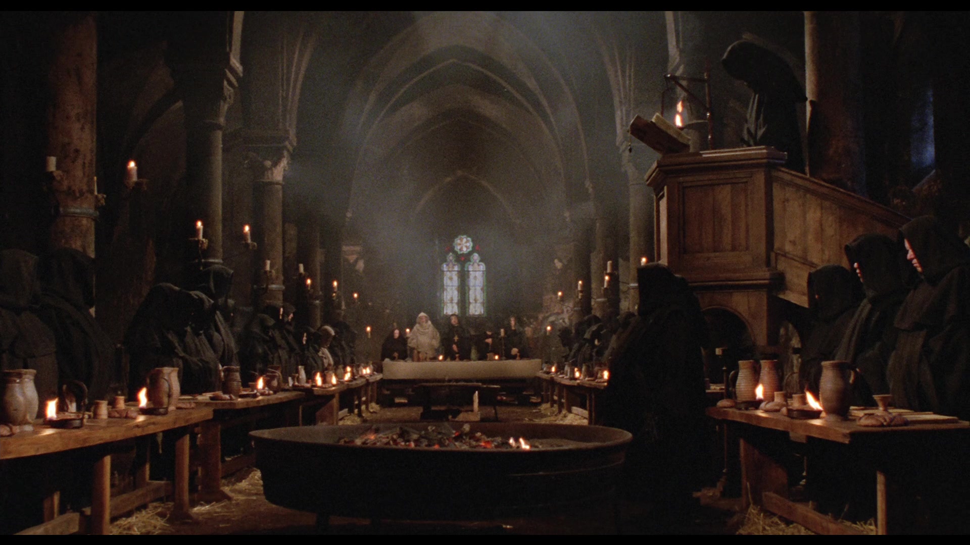 Delli Colli’s solution was to shoot the film in a 1:1.85 ratio, using high speed stock and wide-angle lenses. Given Annaud’s penchant for loose physical direction of his actors, the narrower ratio was better able to both capture them in focus and to showcase the medieval interiors. Exterior scenes were often lit with gas-powered fires to ensure a more authentic, historically appropriate look.
