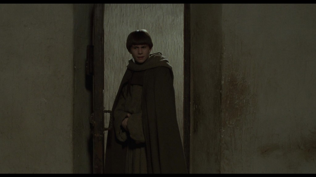 That night, when Wiliam and Adso investigate the abbey’s scriptorium – where illuminated books are copied out by hand – they interrupt Brother Berengar, who steals away with both a book and William’s eye-glasses. They separate to pursue him, unsuccessfully. In the darkness of the abbey’s kitchen, Adso stumbles upon the Girl – who has been trading sexual favours with the monks in exchange for food. She silently attempts intercourse with Adso and he, fearful and awkward, acquiesces.