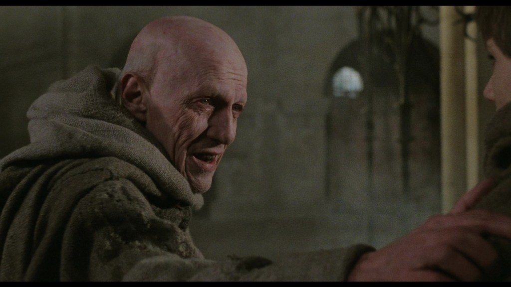 Back within the abbey walls, William and Adso are confronted by Salvatore, a looming hunchback that speaks in a gutteral ramble of dialects. From Salvatore’s use of the phrase ‘penitenziagite’, William deduces that he is likely a reformed heretic and possible murderer. Salvatore’s handler Brother Remigo begs William not to consider him a suspect.