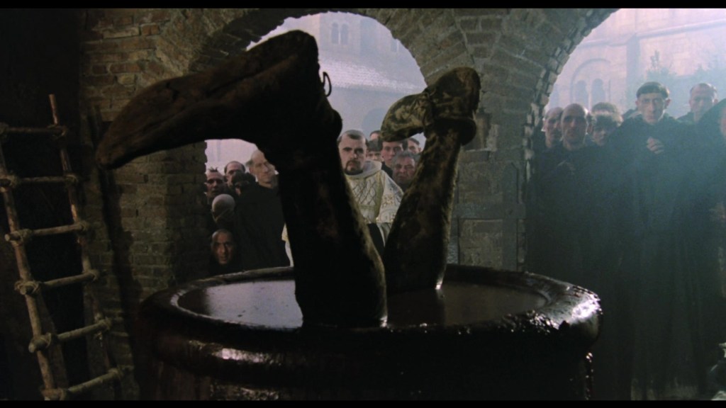 What is striking about Gui’s arrival in the film is that it sets he and William up for a climactic confrontation, but then bifurcates the plot to largely separate them. While William and Adso continue to investigate the murders and the hidden library, Gui uses his inquisitorial powers to accuse and try Salvatore, Remigo, and the Girl. The trail is deliberately absurd and illogical, and its conclusions entirely spurious. Meanwhile William’s investigations are presented as intelligent, logical, and ultimately superior. They are even rewarded in a manner that they are not in Eco’s novel: the book sees the entire library go up in flames with William forced to let the texts perish to save Adso’s life, whereas in the film he manages to both save Adso and emerge from the ruins with a pile of scrolls and volumes in hand.