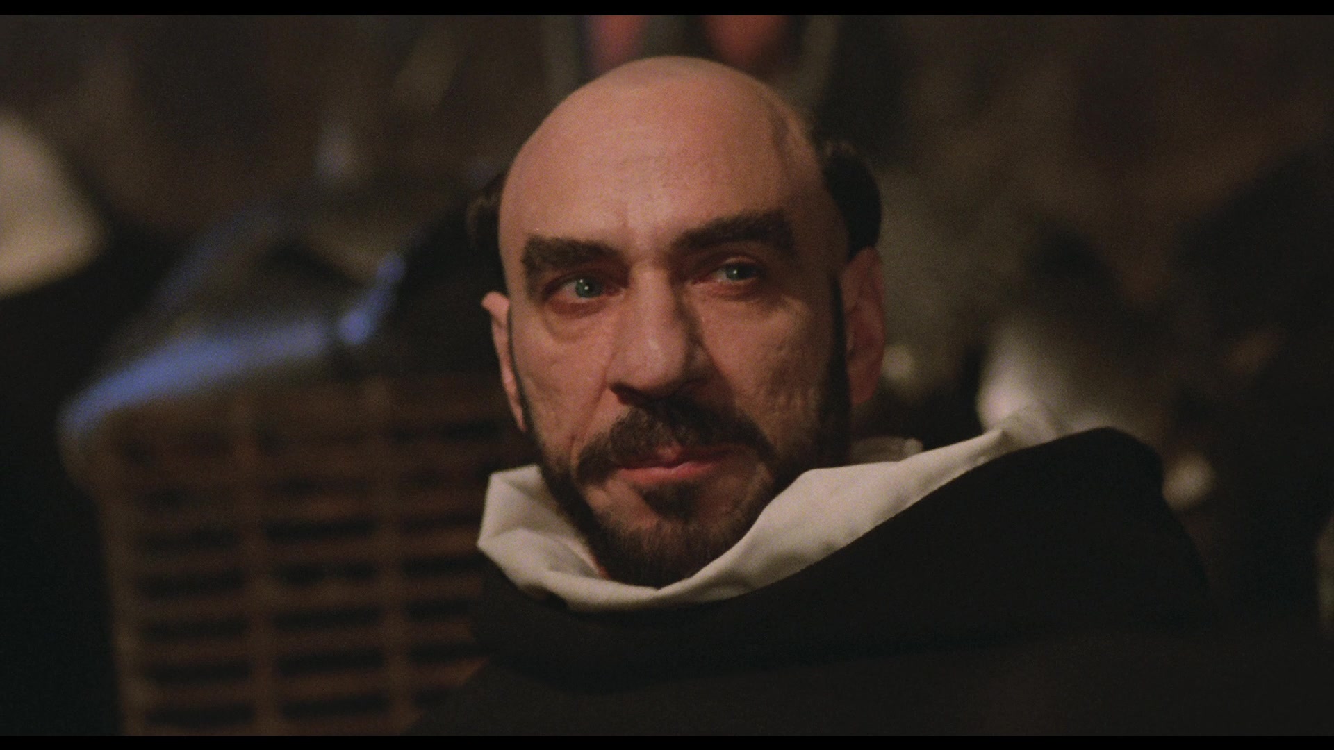 Bernardo Gui arrives 78 minutes into the film, raising the dramatic stakes and providing Brother William with a direct antagonist to fight. The film also quickly establishes a back story between them: they clashed over the prosecution of a translator, with William acquitting the man and Gui condemning him. The argument resulted in William’s imprisonment, torture, and recantation – and the translator’s burning at the state. The translator’s alleged crime? Adapting a non-Christian text from Greek, an act further emphasising Gui’s anti-intellectual stance in the film.