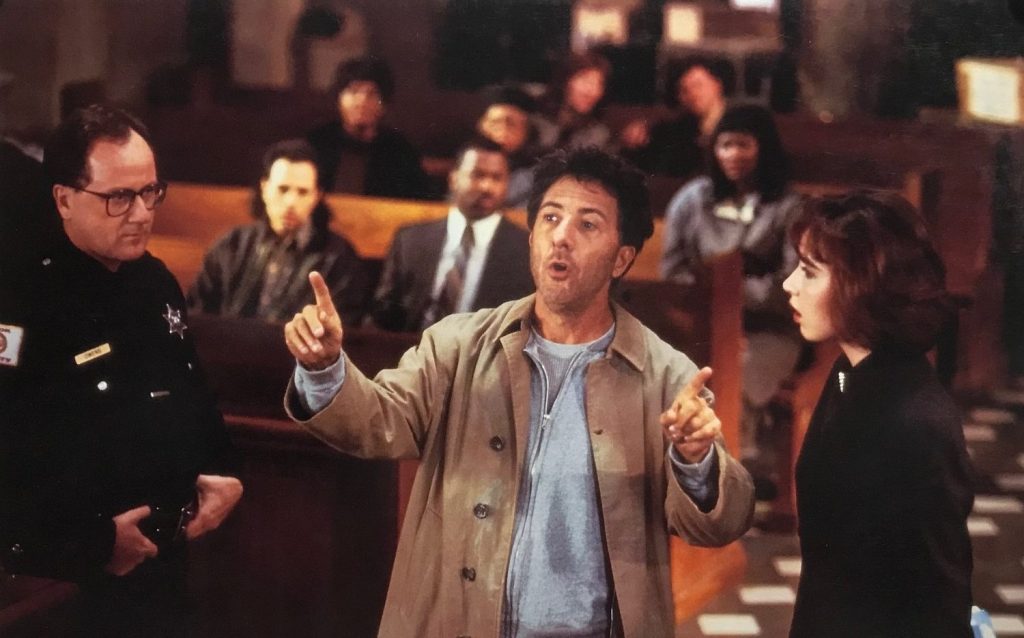 There is a wonderful cynicism to Hero, and it plays out through some quite pointed and brutal satire. Davis’ Gale Gayley is introduced while interviewing a man committing suicide. As Bubber, Garcia talks to the talk of being a national folk hero, but it is all based on opportunism and lies. Even Bernie LaPlante, played with a wonderful gravelly cadence by Dustin Hoffman, is about as reluctant a hero as somebody could be: saving lives, but bemoaning the loss of his hundred-dollar leather shoes in the process. He is not a likeable protagonist, but he likes to think himself to be. He lives a life in paradox, constantly kvetching about his poor fortune while living a criminal life that actively makes that fortune happen. The film generally pushes to find some sort of Capra-esque inner nobility in Bernie; Hoffman plays against that goal with wonderful pettiness.